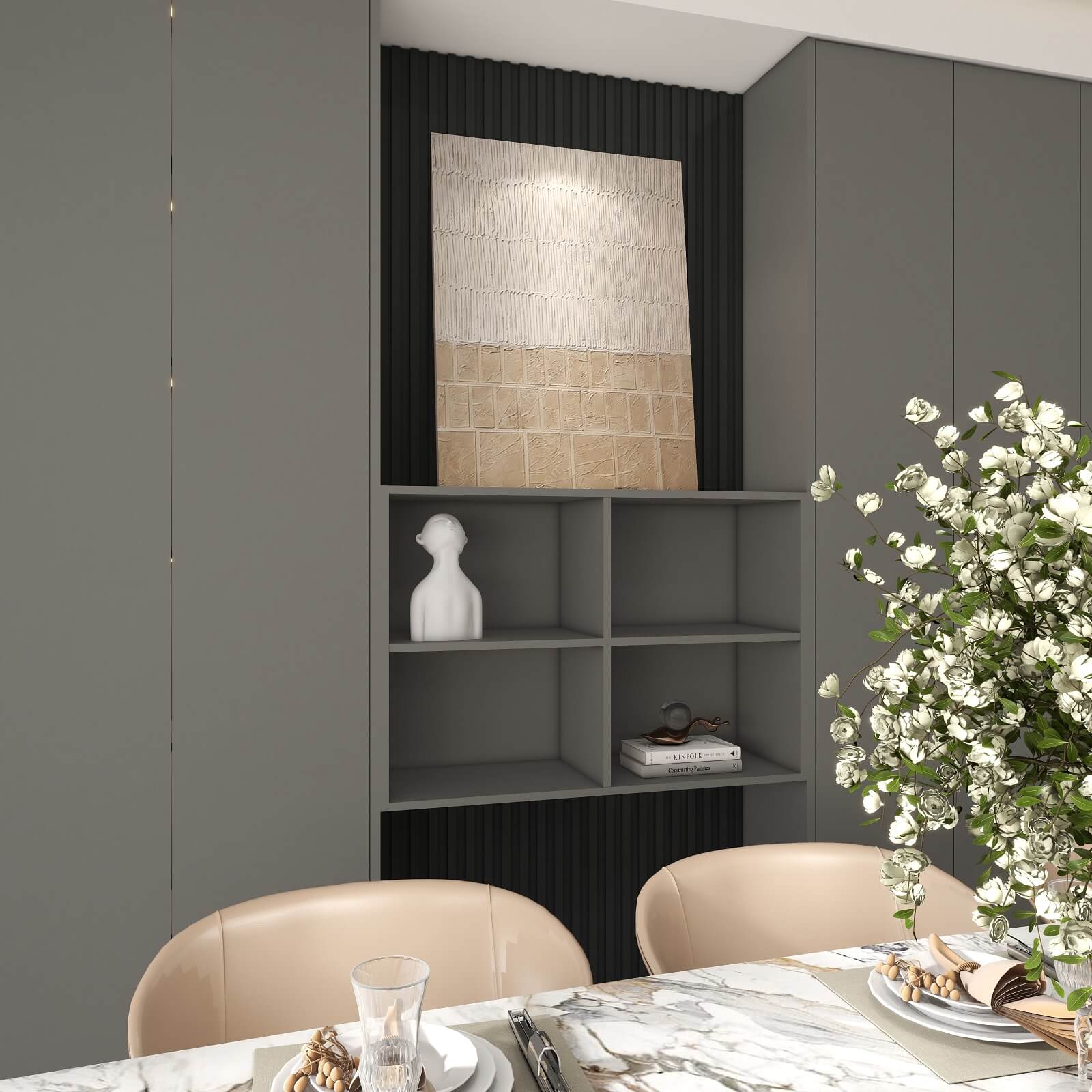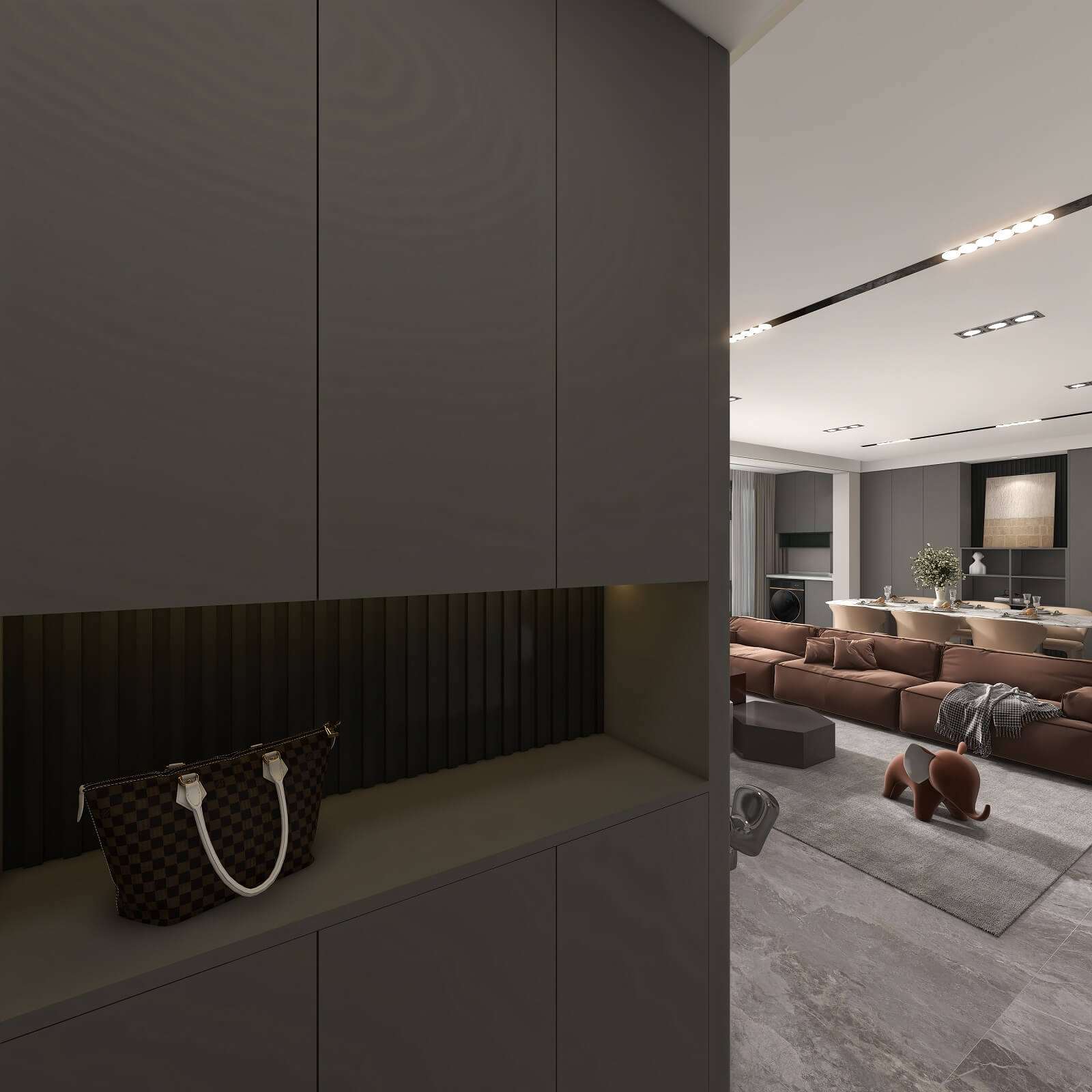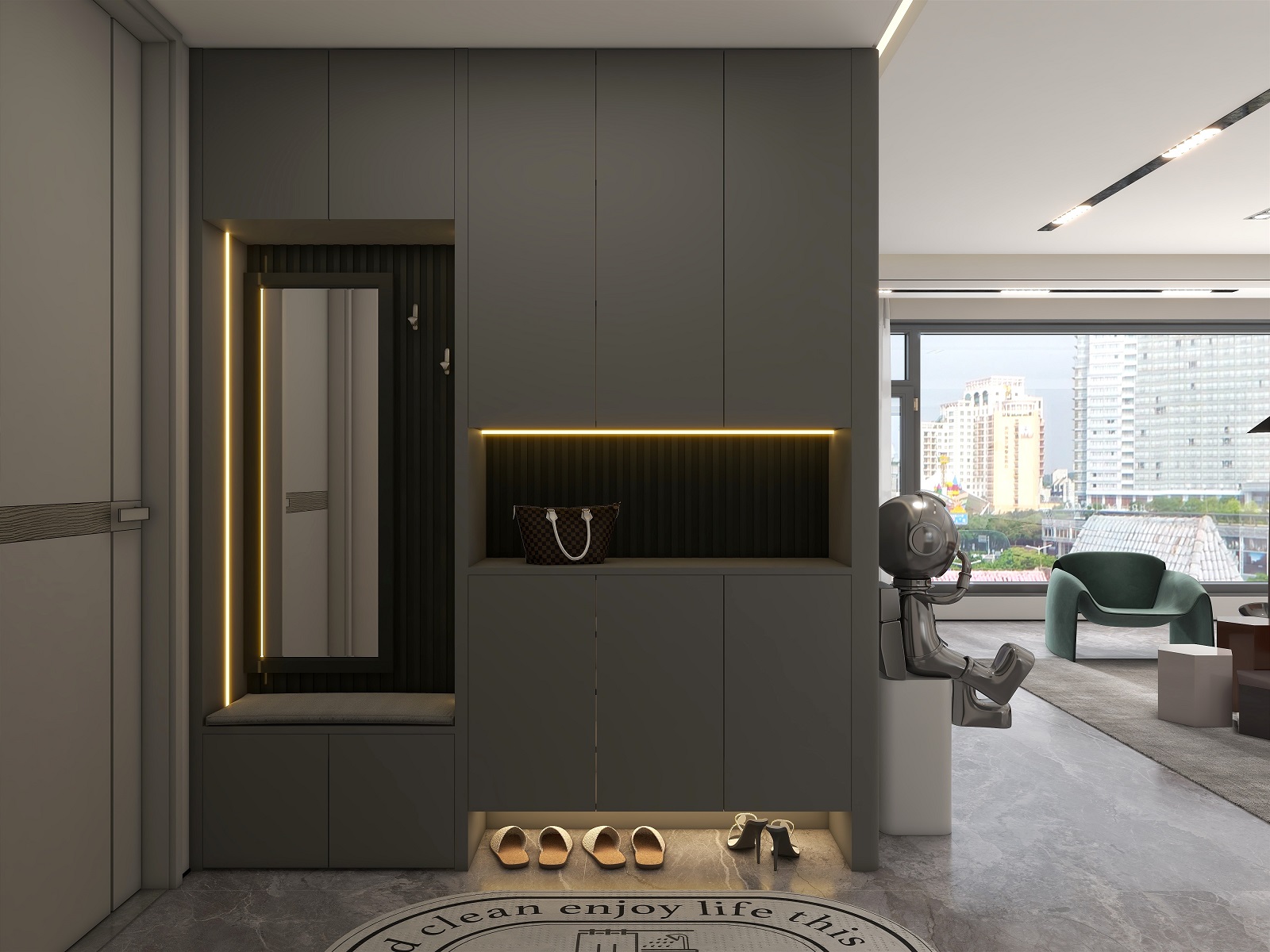 大面積運用深灰色,格柵元素極具設(shè)計感,在層板燈的渲染下整個玄關(guān)輕奢有內(nèi)涵,給空間增添了幾分自然純粹的氣息,讓人身心放松。