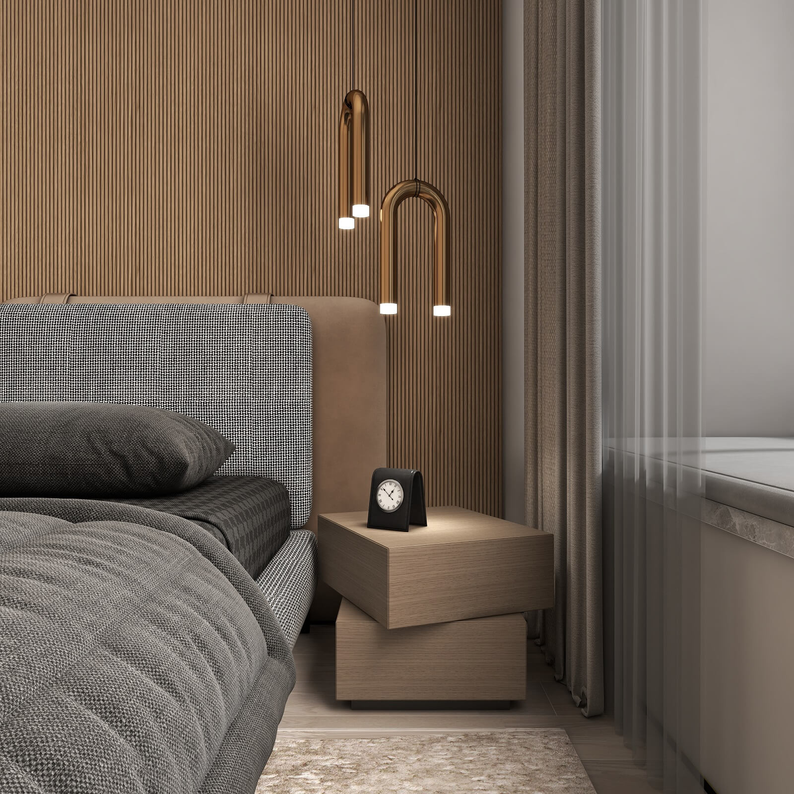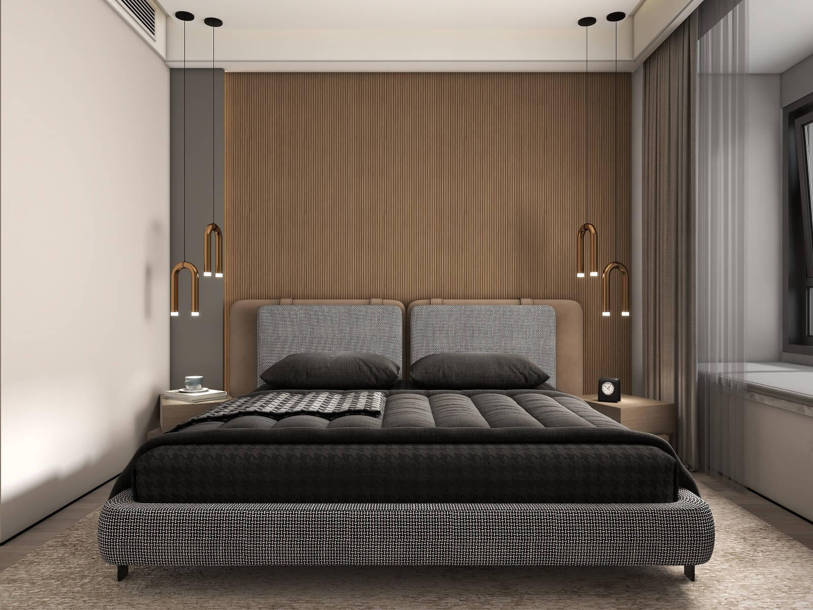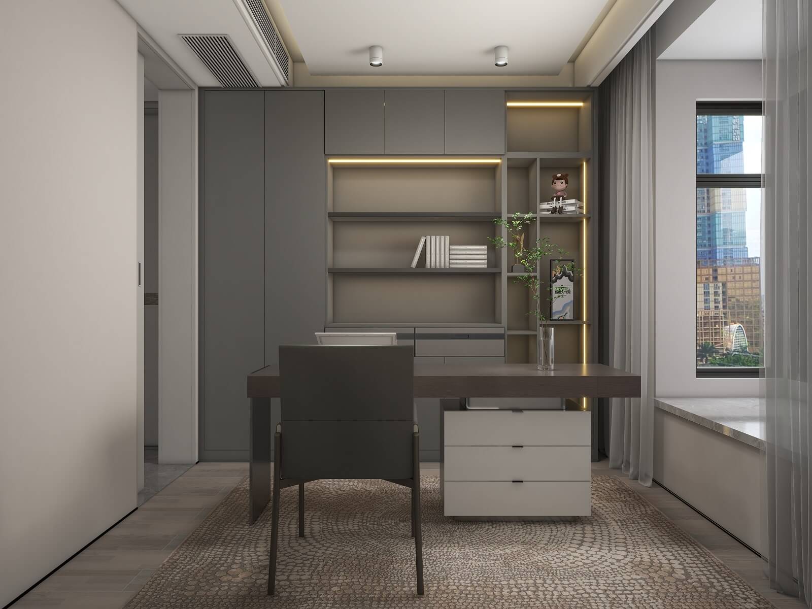 主臥的一切設(shè)計,都有助于睡眠氛圍的營造,黑棕色配合沉靜的物件,從材料到觸感,強調(diào)事物質(zhì)樸的內(nèi)在,能夠展示高端定制木作的本質(zhì)之美。