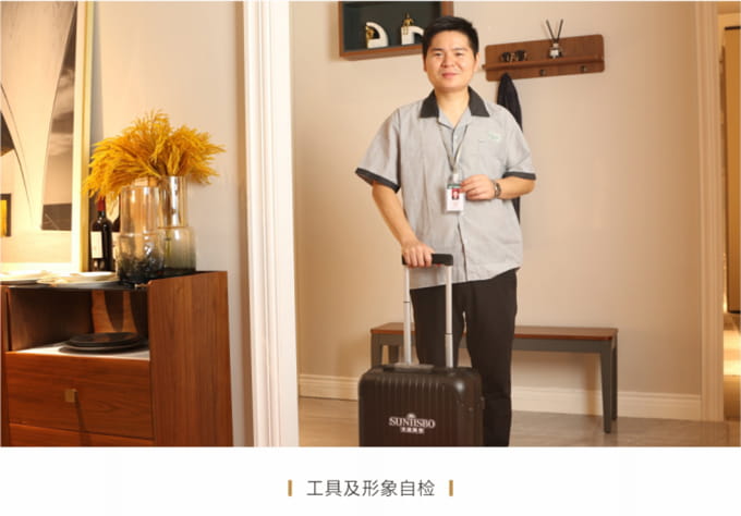 物資準備:上門前必須著我們統一工作服,佩戴工作證,準備好安裝工具、搬抬工具(搬運背帶等)、備件、筆記本、手套、鞋套、地墊、衛生清掃工具(清潔劑、抹布、掃把簸箕、拖把、吸塵器等)、瓶裝水、《我們安裝施工指示牌》、收據和我們產品說明書、《產品配送單》和《配送滿意度調查表》等物品。再帶上小禮品,例:鮮花或碳包去味禮包等。